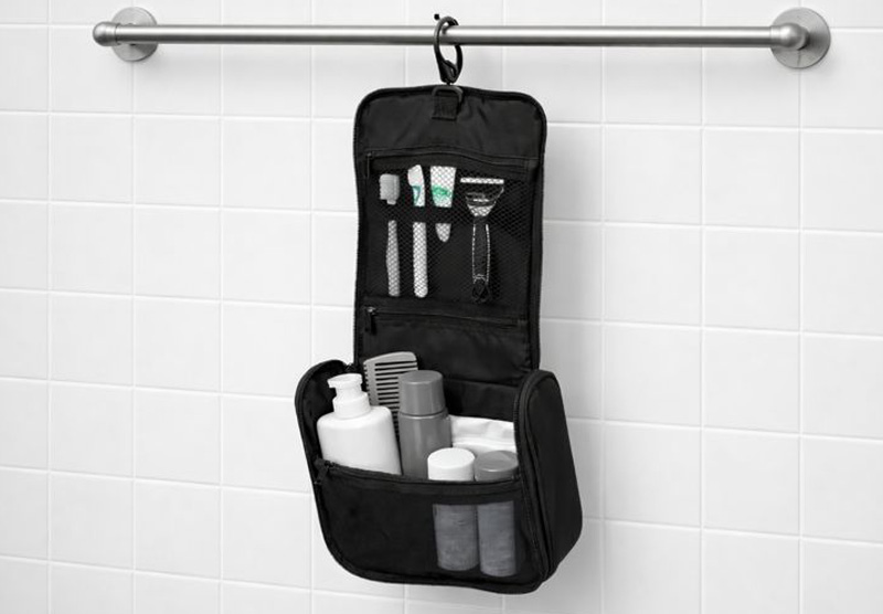 これを見つけた時、めっちゃ感動しました。旅行した時、ホテルの洗面室って置くとこなくないですか?あっても洗面台周りの水が飛んでくる所。なので持参した洗面用具は使うたび、いちいちベッドルームから運んでいました。持って行っても置く所がイマイチなくて使いづらいし。しかしこれがそんな悩みを一気に解決してくれました!タオルかけは必ずあるし、タオルを置く高いところにあるメタルの棚?みたいなのから下げても。ドアについているフックでもOK! 私は黒をアマゾンで購入。グレーもあります。